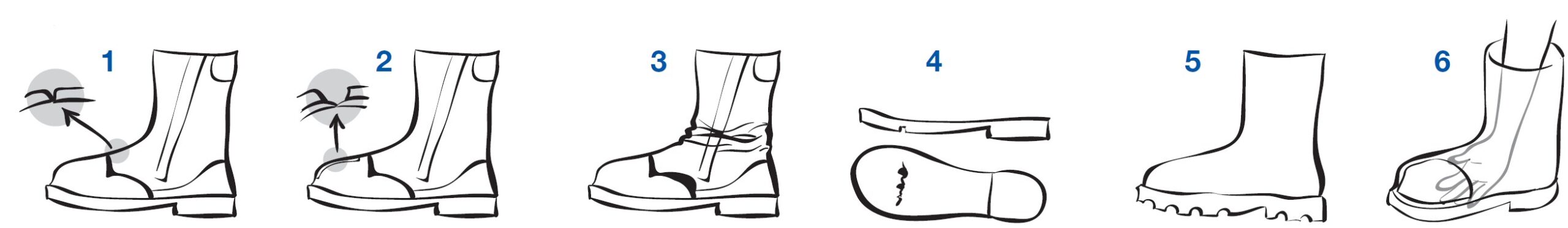 La durée de vie des chaussures dépend du degré d’utilisation. Il faut remplacer les chaussures de sécurité ou les envoyer au service de réparation/entretien lorsque l’on constate l’un des défauts suivants: